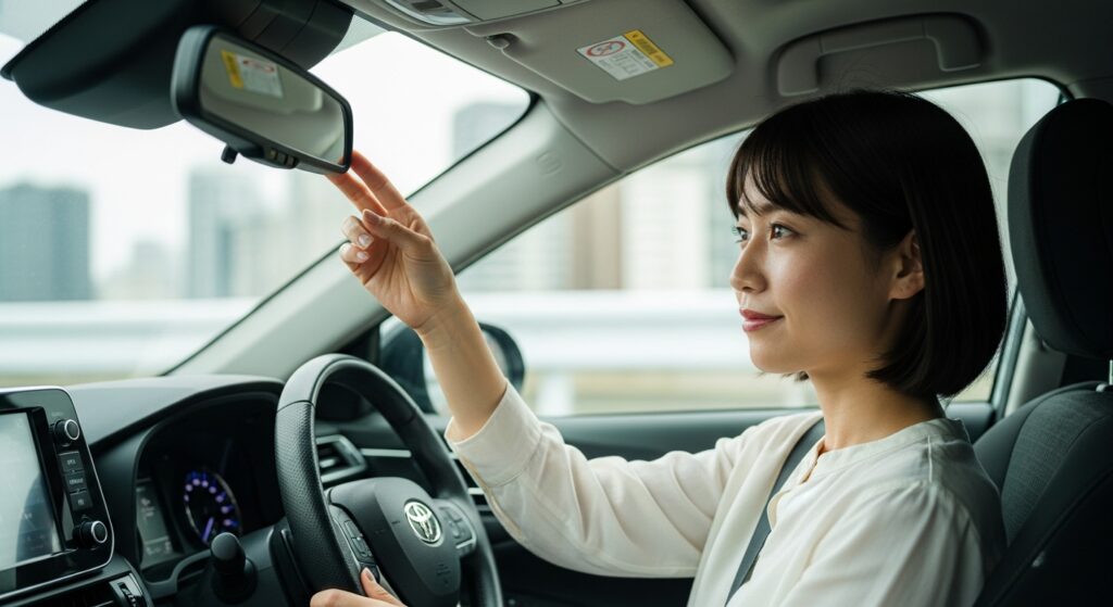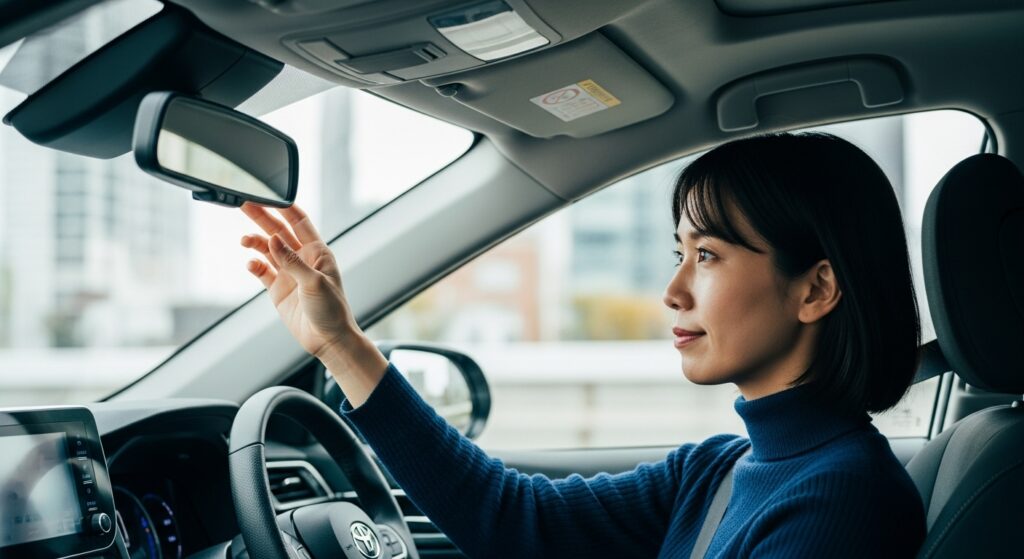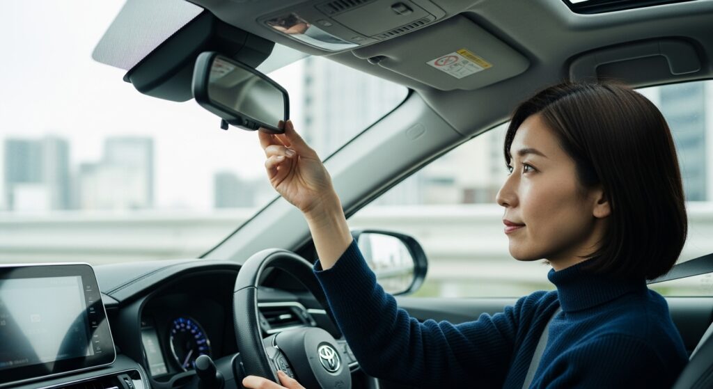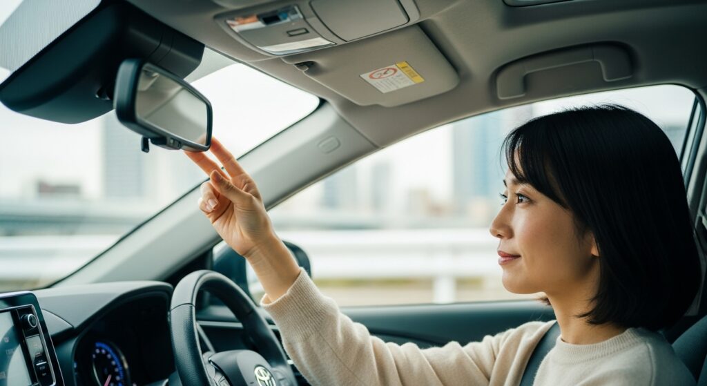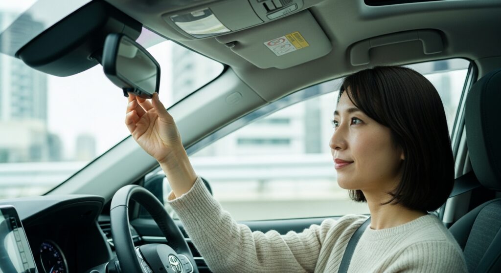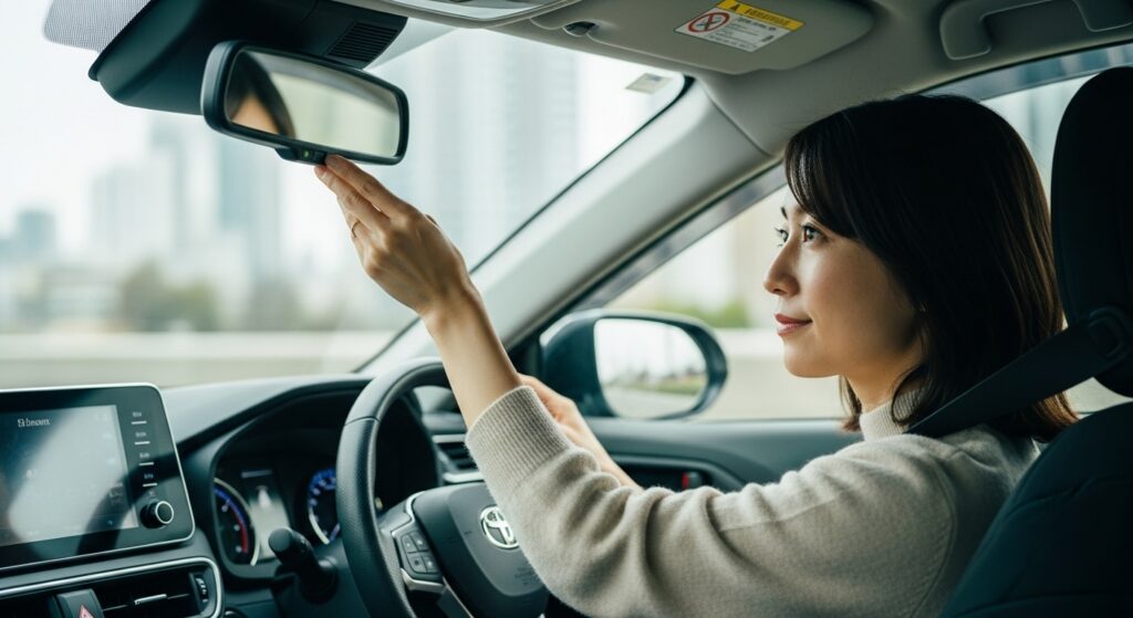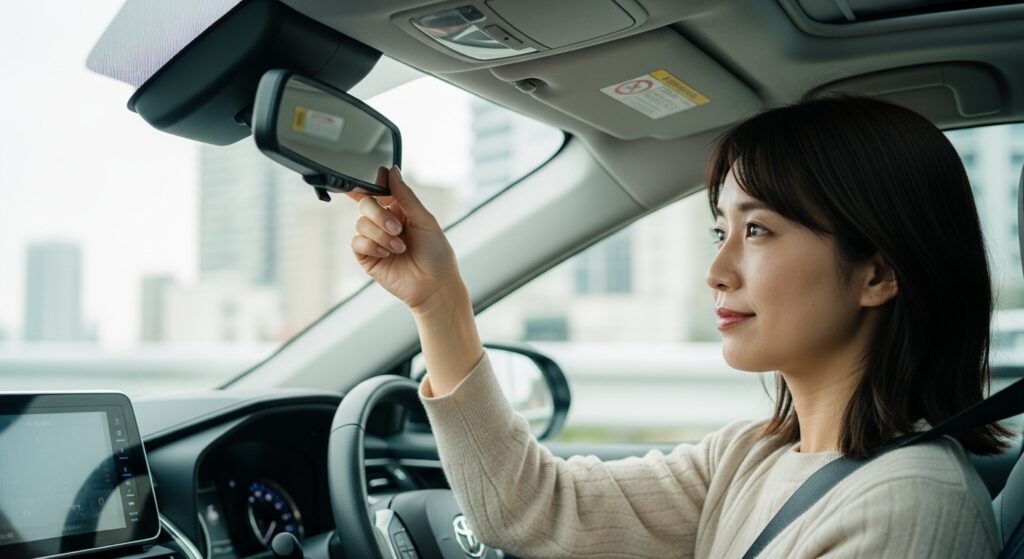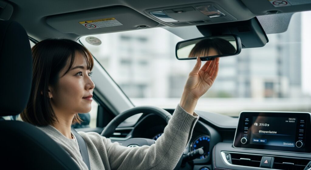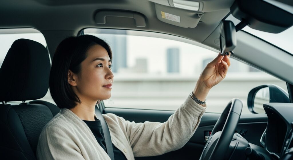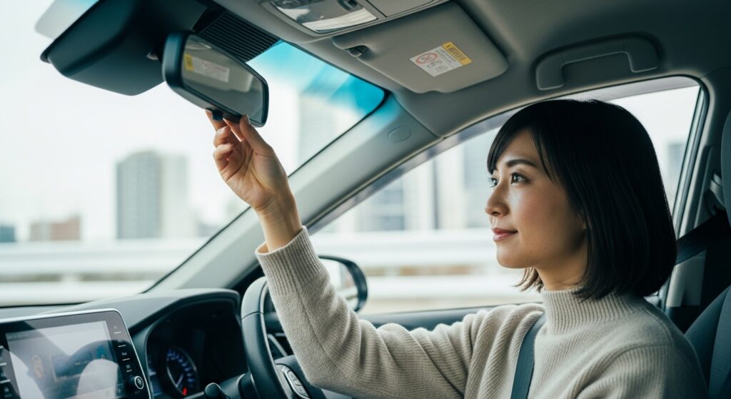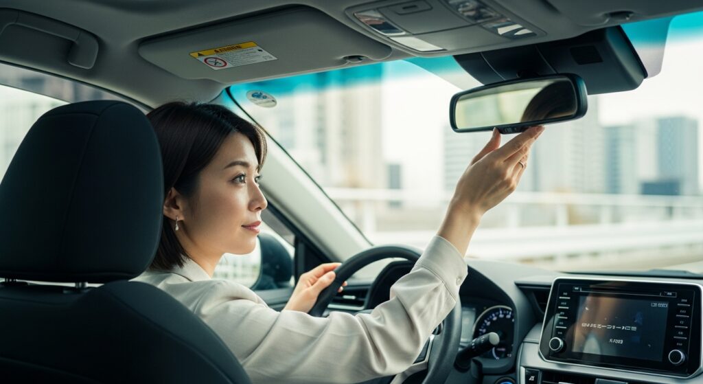 ルームミラーは「後方ガラス全体が中央に見える位置」に設定します。運転席に座ったときに、頭が映り込まない高さが理想です。後続車のライトがまぶしい夜間は、防眩(ナイト)モードに切り替えることを忘れずに。ミラーの角度を合わせたあとは、実際に発進前にもう一度姿勢を確認し、視線を左右に動かして全体のバランスをチェックしてください。